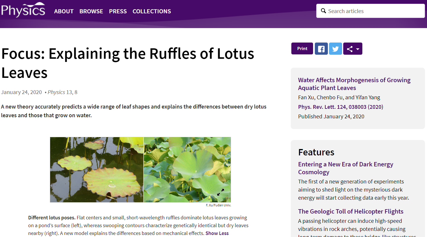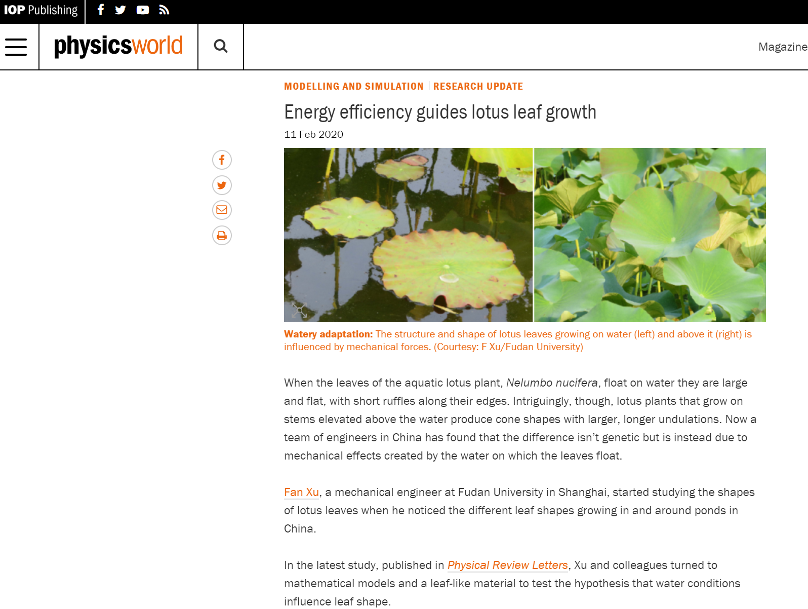 24/01/2020: The paper “Water affects morphogenesis of growing aquatic plant leaves” has been selected for a Focus (Explaining the Ruffles of Lotus Leaves) in Physics. Great congratulations!
