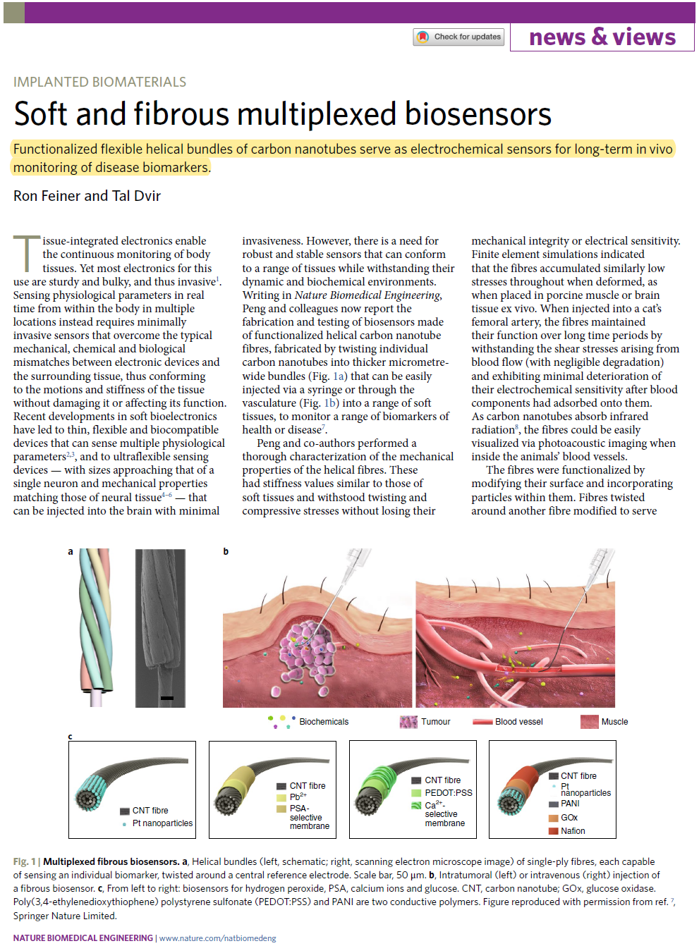 12/02/2020: The paper “Functionalized helical fibre bundles of carbon nanotubes as electrochemical sensors for long-term in vivo monitoring of multiple disease biomarkers” has been highlighted as News & Views (Soft and fibrous multiplexed biosensors) by Nature Biomedical Engineering. Great congratulations!