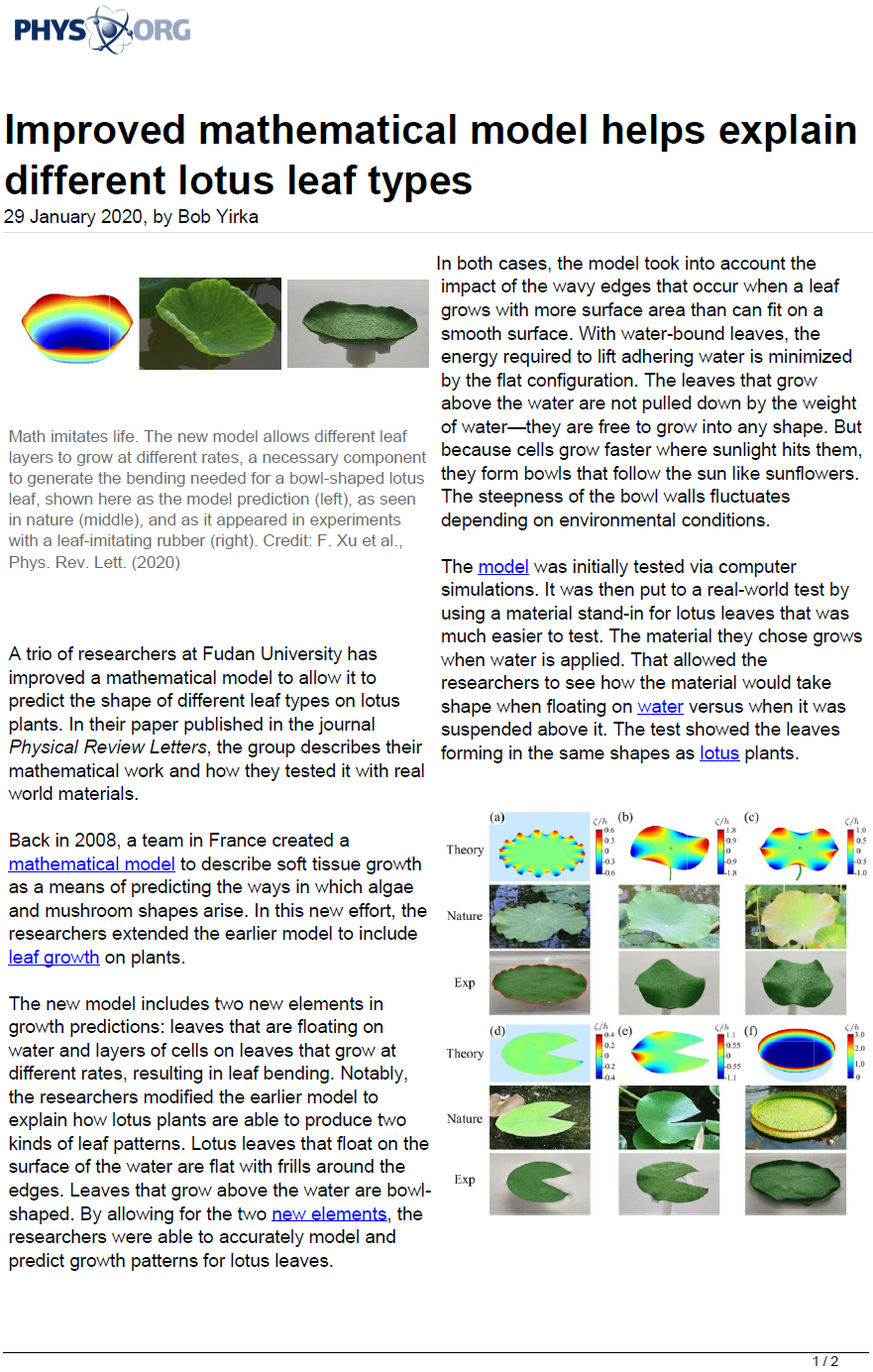 30/01/2020: The paper “Water affects morphogenesis of growing aquatic plant leaves” has been highlighted (Improved mathematical model helps explain different lotus leaf types) by PhysOrg. Great congratulations!