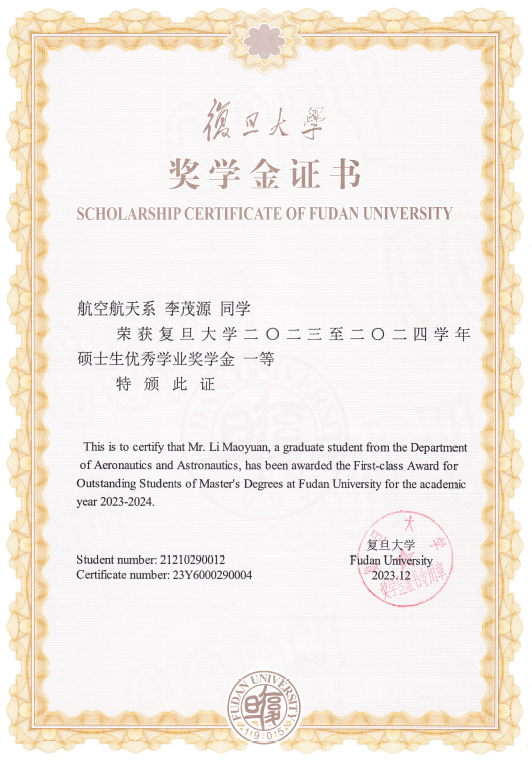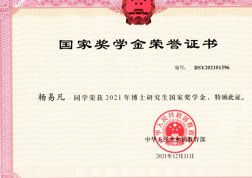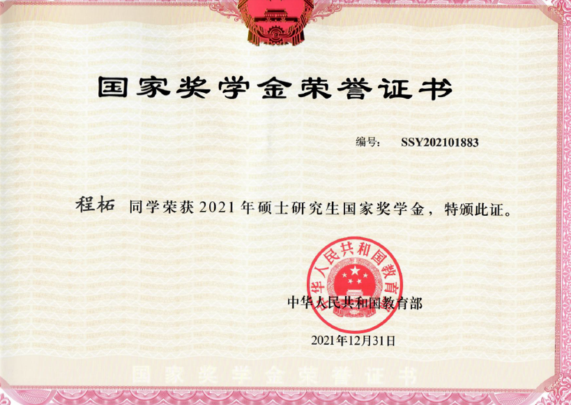 31/12/2021: 祝贺杨易凡荣获2021年博士研究生国家奖学金,程柘荣获2021年硕士研究生国家奖学金,张晓亮荣获博士生优秀学业一等奖学金,李睿扬、刘俊廷分别荣获硕士生优秀学业二等奖学金。