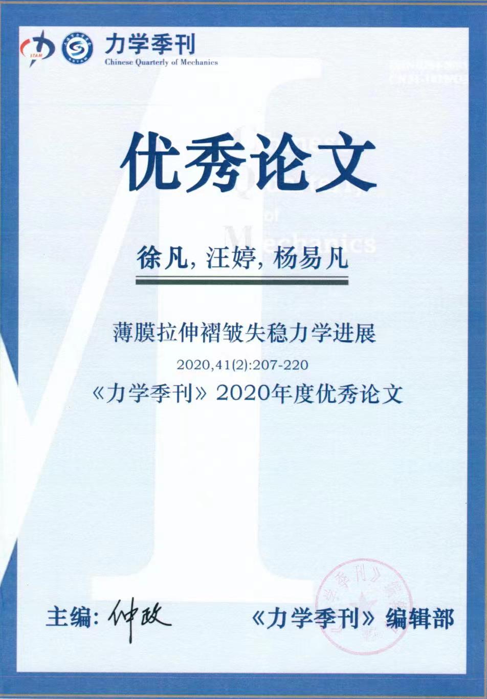 24/10/2022: 祝贺荣获《力学季刊》2020年度优秀论文!